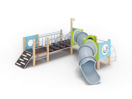 Детский игровой комплекс состоит из трех башен. На первой башне установлены трап, ограждение с иллюминатором, ручки вспомогательные, перекладины. На второй башне установлены лестница, ручки вспомогательные, ограждение с иллюминатором и два декоративных фанерных флажка. На третьей башне установлены лиана наклонная, горка-труба пластиковая, ограждение с иллюминатором и перекладина. Первая и вторая башня соединены подвесным качающимся мостом, вторая и третья башни соединены пластиковой изогнутой трубой переходом.