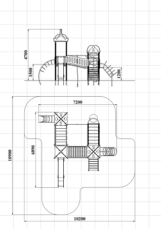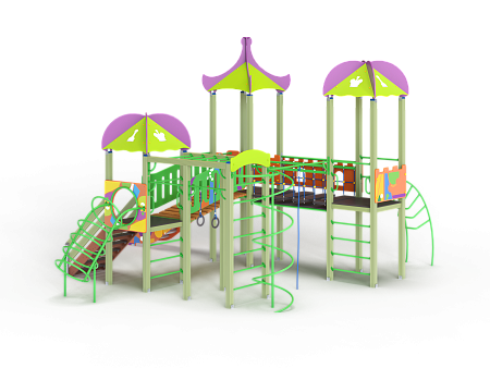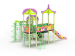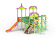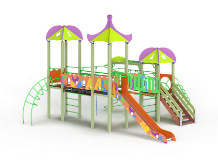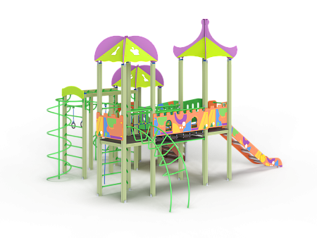 Детский игровой комплекс состоит из трех башен с крышами, имеет художественное оформление в стиле граффити. На первой башне установлена лестница, спираль наклонная, ручки вспомогательные, ограждение с круглым лазом, вынесенная шведская стенка с рукоходом, перекладиной с гимнастическими кольцами и шестом спиралью. На второй башне установлена горка и фанерное ограждение. На третьей башне установлена лиана, ручки вспомогательные, ограждение фанерное с декоративными элементам и шведская стенка. Первая и вторая башни соединяются разновысоким мостом с фанерными перилами. Вторая и третья башни соединены подвесным качающимся мостом с фанерным ограждением.