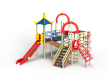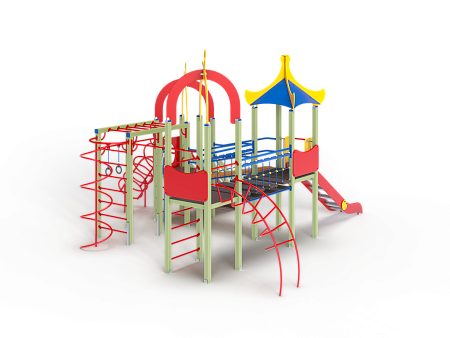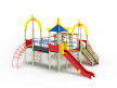 Детский игровой комплекс состоит из трех башен с крышами. На первой башне установлена лестница, спираль наклонная, ручки вспомогательные, ограждение с круглым лазом, вынесенная шведская стенка с рукоходом, перекладиной с гимнастическими кольцами и шестом спиралью. На второй башне установлена горка и фанерное ограждение. На третьей башне установлена лиана, ручки вспомогательные, ограждение фанерное и шведская стенка. Первая и вторая башни соединяются разновысоким мостом с металлическими перилами. Вторая и третья башни соединены подвесным качающимся мостом.