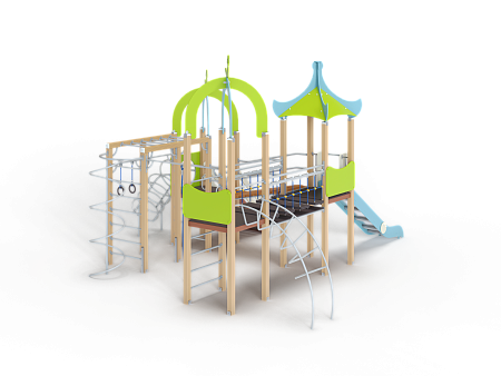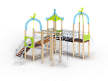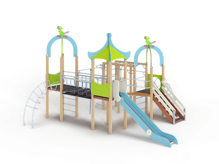 Детский игровой комплекс состоит из трех башен с крышами. На первой башне установлена лестница, спираль наклонная, ручки вспомогательные, ограждение с круглым лазом, вынесенная шведская стенка с рукоходом, перекладиной с гимнастическими кольцами и шестом спиралью. На второй башне установлена горка и фанерное ограждение. На третьей башне установлена лиана, ручки вспомогательные, ограждение фанерное и шведская стенка. Первая и вторая башни соединяются разновысоким мостом с металлическими перилами. Вторая и третья башни соединены подвесным качающимся мостом.