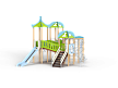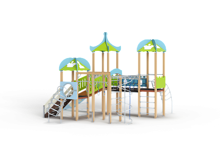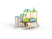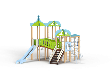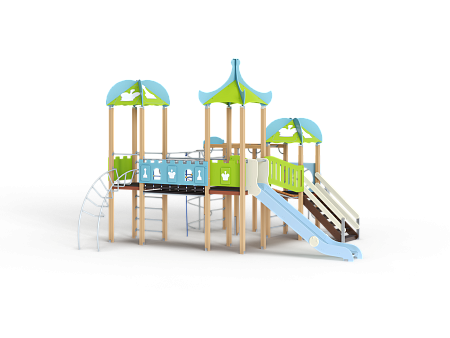 Детский игровой комплекс состоит из трех башен с крышами. На первой башне установлена лестница, спираль наклонная, ручки вспомогательные, ограждение с круглым лазом, вынесенная шведская стенка с рукоходом, перекладиной с гимнастическими кольцами и шестом спиралью. На второй башне установлена горка и фанерное ограждение с декоративными элементами. На третьей башне установлена лиана, ручки вспомогательные, ограждение фанерное с декоративными элементам и шведская стенка. Первая и вторая башни соединяются разновысоким мостом с фанерными перилами. Вторая и третья башни соединены подвесным качающимся мостом с фанерным ограждением и декоративными элементами.