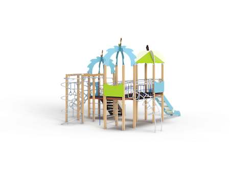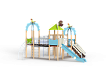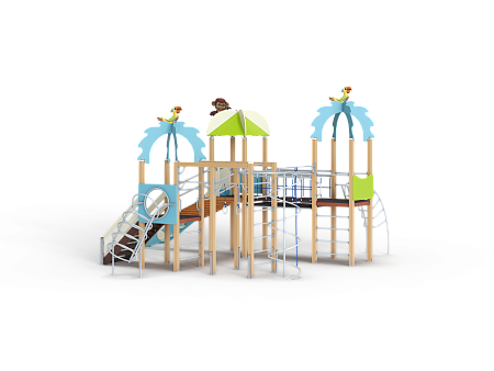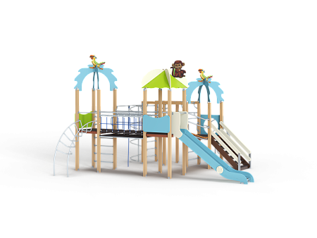 Детский игровой комплекс состоит из трех башен с крышами. На первой башне установлена лестница, спираль наклонная, ручки вспомогательные, ограждение с круглым лазом, вынесенная шведская стенка с рукоходом, перекладиной с гимнастическими кольцами и шестом спиралью. На второй башне установлена горка и фанерное ограждение. На третьей башне установлена лиана, ручки вспомогательные, ограждение фанерное и шведская стенка. Первая и вторая башни соединяются разновысоким мостом с металлическими перилами. Вторая и третья башни соединены подвесным качающимся мостом.