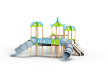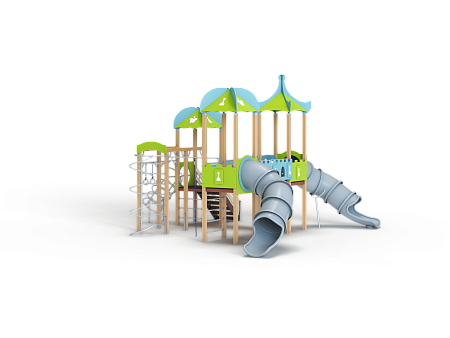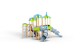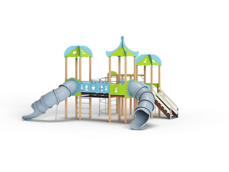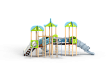 Детский игровой комплекс состоит из трех башен с крышами. На первой башне установлена лестница, спираль наклонная, ручки вспомогательные, ограждение с круглым лазом, вынесенная шведская стенка с рукоходом, перекладиной с гимнастическими кольцами и шестом спиралью. На второй башне установлена горка-труба пластиковая и фанерное ограждение с декоративными элементами. На третьей башне установлена горка-труба пластиковая, ручки вспомогательные, ограждение фанерное с декоративными элементам и шведская стенка. Первая и вторая башни соединяются разновысоким мостом с фанерными перилами. Вторая и третья башни соединены подвесным качающимся мостом с фанерным ограждением с декоративными элементам.