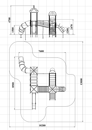 Детский игровой комплекс состоит из трех башен с крышами. На первой башне установлена лестница, спираль наклонная, ручки вспомогательные, ограждение с круглым лазом, вынесенная шведская стенка с рукоходом, перекладиной с гимнастическими кольцами и шестом спиралью. На второй башне установлена горка и фанерное ограждение с декоративными элементами. На третьей башне установлена горка-труба пластиковая, ручки вспомогательные, ограждение фанерное с декоративными элементам и шведская стенка. Первая и вторая башни соединяются разновысоким мостом с фанерными перилами. Вторая и третья башни соединены подвесным качающимся мостом с фанерным ограждением и декоративными элементами.