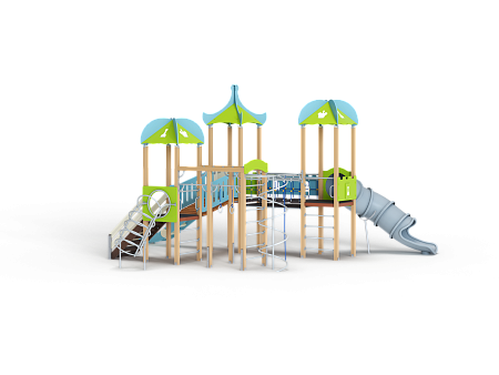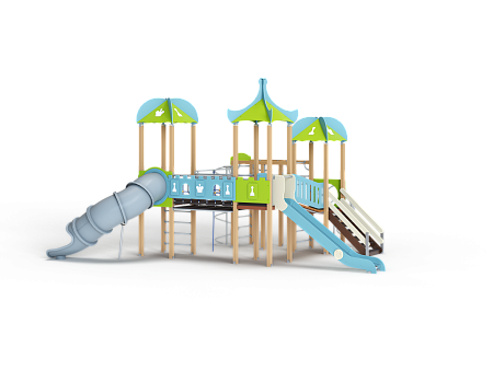 Детский игровой комплекс состоит из трех башен с крышами. На первой башне установлена лестница, спираль наклонная, ручки вспомогательные, ограждение с круглым лазом, вынесенная шведская стенка с рукоходом, перекладиной с гимнастическими кольцами и шестом спиралью. На второй башне установлена горка и фанерное ограждение с декоративными элементами. На третьей башне установлена горка-труба пластиковая, ручки вспомогательные, ограждение фанерное с декоративными элементам и шведская стенка. Первая и вторая башни соединяются разновысоким мостом с фанерными перилами. Вторая и третья башни соединены подвесным качающимся мостом с фанерным ограждением и декоративными элементами.
