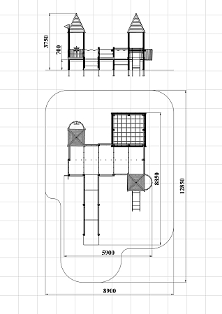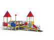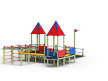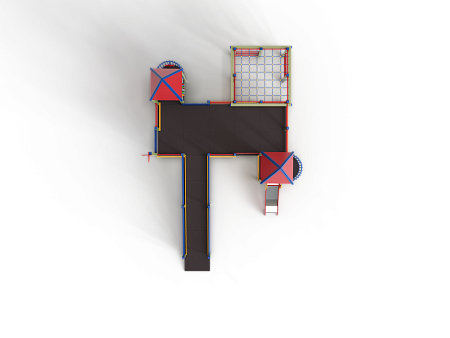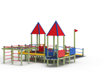 Детский игровой комплекс предназначен для детей с ограниченными физическими возможностями, он состоит из пяти сдвоенных открытых башен и двух башен с пирамидальными крышами. На одной из башен установлена горка, балкон, металлическое ограждение из перекладин. На другой башне установлено фанерное ограждение, балкон с фанерным рулём и комплект детских счет с разноцветными пластиковыми бубликами. Обе башни расположены диагонально друг напротив друга. Между ними расположены пять двойных площадок с ограждениями по периметру из металлических перекладин и фанерных ограждений. Вход на площадку осуществлен в виде двойного наклонного трапа с металлическими перилами. Сбоку от площадки расположен спортивный комплекс, состоящий из столбов, шведских стенок и горизонтальной полипропиленовой сетки. Ограждением комплекса также служит брус расположенный по периметру комплекса над ламинированными полами. В углу комплекса расположен столб с декоративными фанерными флажками.