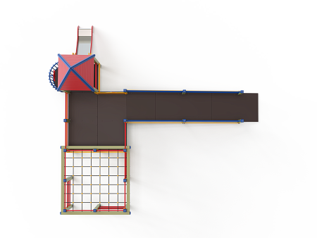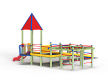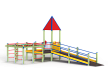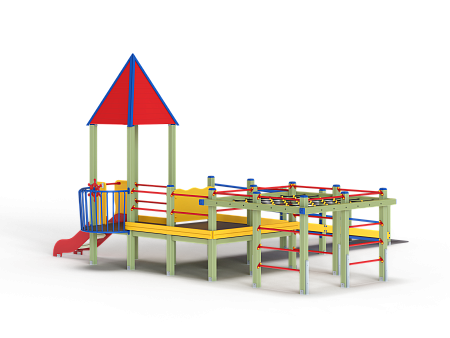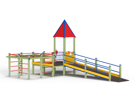 Детский игровой комплекс предназначен для детей с ограниченными физическими возможностями, он состоит из двух сдвоенных открытых башен и башни с пирамидальной крышей. На башне установлена горка, балкон с фанерным штурвалом, металлическое ограждение из перекладин. По периметру комплекса установлены ограждения из металлических перекладин и одного фанерного ограждения с декоративным элементом. Вход на площадку осуществлен в виде двойного наклонного трапа с металлическими перилами. Сбоку от площадки расположен спортивный комплекс, состоящий из столбов, шведских стенок и горизонтальной полипропиленовой сетки. Ограждением комплекса также служит брус расположенный по периметру комплекса над ламинированными полами.