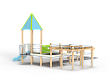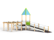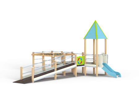 Детский игровой комплекс предназначен для детей с ограниченными физическими возможностями, он состоит из двух сдвоенных открытых башен и башни с пирамидальной крышей. На башне установлена горка, балкон с фанерным штурвалом, металлическое ограждение из перекладин. По периметру комплекса установлены ограждения из металлических перекладин и одного фанерного ограждения с декоративным элементом. Вход на площадку осуществлен в виде двойного наклонного трапа с металлическими перилами. Сбоку от площадки расположен спортивный комплекс, состоящий из столбов, шведских стенок и горизонтальной полипропиленовой сетки. Ограждением комплекса также служит брус расположенный по периметру комплекса над ламинированными полами.