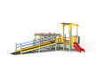 Детский игровой комплекс предназначен для детей с ограниченными физическими возможностями, он состоит из двух сдвоенных открытых башен и башни с фасонной крышей. На башне установлена горка, балкон с фанерным штурвалом, металлическое ограждение из перекладин. По периметру комплекса установлены ограждения из металлических перекладин и одного фанерного ограждения с декоративным элементом. Вход на площадку осуществлен в виде двойного наклонного трапа с металлическими перилами. Сбоку от площадки расположен спортивный комплекс, состоящий из столбов, шведских стенок и горизонтальной полипропиленовой сетки. Ограждением комплекса также служит брус расположенный по периметру комплекса над ламинированными полами.