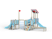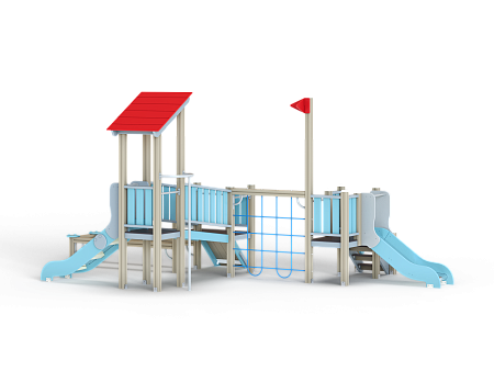 Детский игровой комплекс состоит из трёх башен с вынесенным спорткомплексом в виде бум брёвен. На первой башне установлены крыша наклонная, ограждение из бруса, шест, перекладина. На второй башне установлены трап из бруса с альпинистскими камнями, три ограждения из бруса, две перекладины и примыкающий к ней спорткомплекс. На третьей башне установлены лестница, горка, перекладина, декоративные флажки и три ограждения из бруса. Первая и вторая башни соединены наклонным мостом из бруса, вторая и третья башни соединены полипропиленовой сеткой.