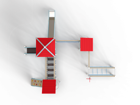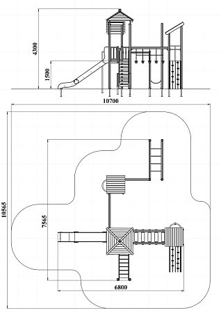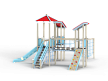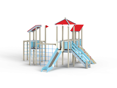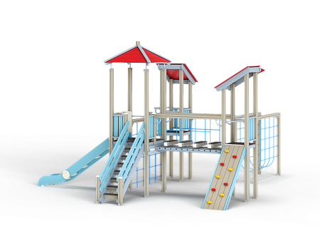 Детский игровой комплекс состоит из трёх башен с вынесенным спорткомплексом в виде канатного перехода на деревянных столбах. На первой башне установлены крыша наклонная, два ограждения из бруса, шест, две перекладины и примыкающий к ней спорткомплекс. На второй башне установлены горка, крыша четырехскатная, четыре ограждения из бруса, лестница и две перекладины. На третьей башне установлены крыша наклонная, трап из бруса с альпинистскими камнями, шест, три перекладины и ограждение из бруса. Первая и вторая башни соединены полипропиленовой сеткой, вторая и третья башни соединены мостом подвесным из деревянного бруса и полипропиленового каната.
