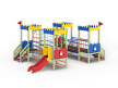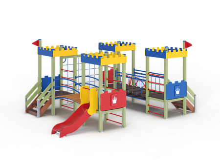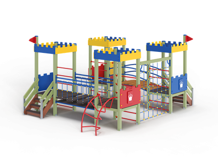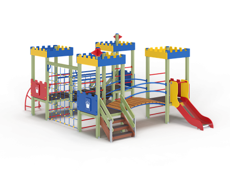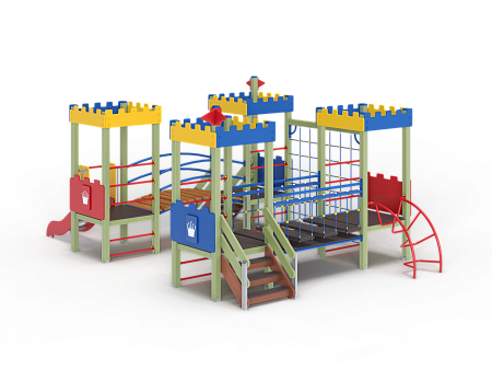 Детский игровой комплекс состоит из четырёх башен с крышами. На первой башне установлена ограждение фанерное с декоративной накладкой, лестница, перекладины и декоративные флажки. На второй башне установлено ограждение фанерное с декоративной накладкой, лиана наклонная и перекладины. На третьей башне установлено ограждение фанерное с декоративной накладкой, декоративные флажки и лестница. На четвертой башне установлено ограждение фанерное с декоративной накладкой, перекладины и горка. Первая башня соединена подвесным качающимся мостом со второй. Вторая соединяется с третьей сеткой полипропиленовой. Третья соединяется с четвёртой мостом радиусным с металлическими перилами.