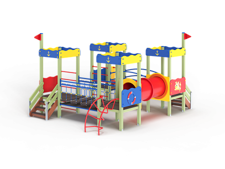 Детский игровой комплекс состоит из четырёх башен с крышами. На первой башне установлена ограждение фанерное с художественным оформлением, лестница, перекладины и декоративные флажки. На второй башне установлено ограждение фанерное с художественным оформлением, лиана наклонная и перекладины. На третьей башне установлено ограждение фанерное с художественным оформлением, декоративные флажки и лестница. На четвертой башне установлено ограждение фанерное с художественным оформлением, перекладины и горка. Первая башня соединена подвесным качающимся мостом со второй. Вторая соединяется с третьей пластиковой трубой переходом. Третья соединяется с четвёртой мостом радиусным с металлическими перилами.