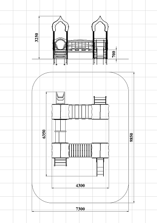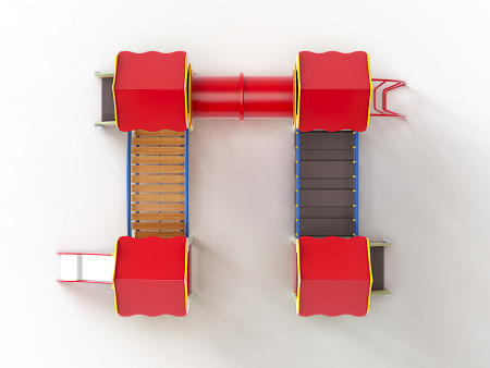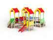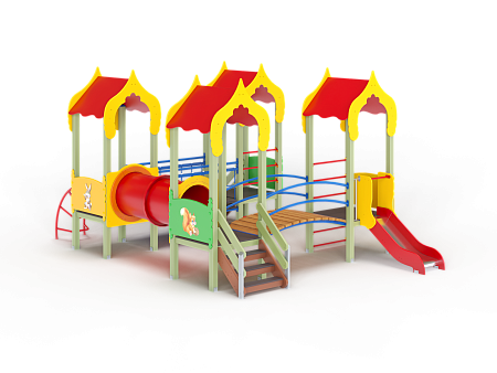 Детский игровой комплекс состоит из четырёх башен с крышами. На первой башне установлена ограждение фанерное с художественным оформлением, лестница, перекладины. На второй башне установлено ограждение фанерное с художественным оформлением, лиана наклонная и перекладины. На третьей башне установлено ограждение фанерное с художественным оформлением и лестница. На четвертой башне установлено ограждение фанерное с художественным оформлением, перекладины и горка. Первая башня соединена подвесным качающимся мостом со второй. Вторая соединяется с третьей пластиковой трубой переходом. Третья соединяется с четвёртой мостом радиусным с металлическими перилами.