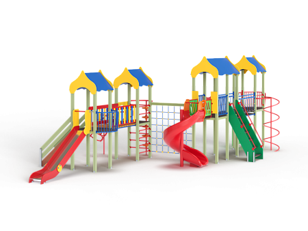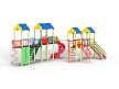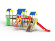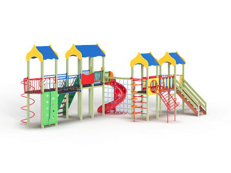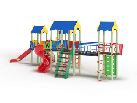 Детский игровой комплекс состоит из четырёх башен с крышами. На первой башне установлена лестница, горка, балкон, перекладина, На второй башне установлены две шведских стенки, шест с пластиковыми колесами, фанерное ограждение с круглым вырезом, спираль, ручки вспомогательные и перекладины. На третьей сдвоенной башне установлены горка винтовая пластиковая, ограждения металлические, ограждение фанерное, лестница с металлическими поручнями. На четвертой башне установлены альпинистская стенка с перекладиной и канатом, шест спираль, балкон, шведская стенка, перекладина и вспомогательные ручки. Первая и вторая башни соединены прямым мостом с фанерными перилами из балясин, вторая и третья сеткой полипропиленовой, третья и четвертая подвесным качающимся мостом.