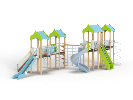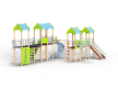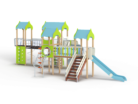 Детский игровой комплекс состоит из четырёх башен с крышами. На первой башне установлена лестница, горка, балкон, перекладина, На второй башне установлены две шведских стенки, шест с пластиковыми колесами, фанерное ограждение с круглым вырезом, спираль, ручки вспомогательные и перекладины. На третьей сдвоенной башне установлены горка винтовая пластиковая, ограждения металлические, ограждение фанерное, лестница с металлическими поручнями. На четвертой башне установлены альпинистская стенка с перекладиной и канатом, шест спираль, балкон, шведская стенка, перекладина и вспомогательные ручки. Первая и вторая башни соединены прямым мостом с фанерными перилами из балясин, вторая и третья сеткой полипропиленовой, третья и четвертая подвесным качающимся мостом.