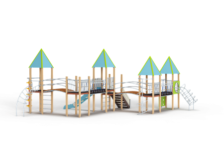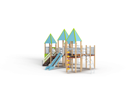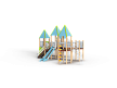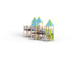 Детский игровой комплекс состоит из шести башен, на четырёх башнях установлены пирамидальные крыши. На первой башне установлена крыша, спираль, фанерное ограждение с круглым лазом, ручки вспомогательные, ограждение металлическое, альпинистская стенка с перекладиной и канатом. На второй башне установлены крыша, ограждение металлическое, шест спираль, перекладина и ручки вспомогательные. На третьей башне (полубашня) установлены лестница, перекладины и шведская стенка. На четвертой установлены крыша, ограждение металлическое, горка и ручки вспомогательные. На пятой башне установлены два металлических ограждения. На шестой башне установлены крыша, шведская стенка, лиана наклонная, шест с колесами пластиковыми, перекладины и ручки вспомогательные. Первая и вторая башни соединены подвесным качающимся мостом. Вторая и третья башни соединены радиусным мостом с металлическими перилами. Четвертая и пятая башни соеденины подвесным качающимся мостом. Пятая и шестая башни соединены радиусным мостом с металлическими перилами.
