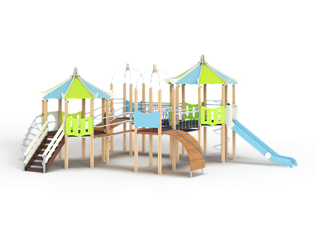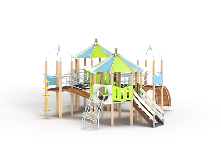 Детский игровой комплекс состоит из четырех башен. На двух башнях установлена крыша в форме восьмигранной пагоды, на двух установлена крыша металлическая со столбом. На восьмигранных башнях установлены горка, шест спираль, ручки вспомогательные, спираль наклонная, фанерное ограждение с круглым лазом, лестница и фанерные ограждения. На башнях с металлической крышей установлены шест с колесами пластиковыми, ручки вспомогательные, трап барабан с перекладиной и канатом и фанерные ограждения. Башни соединены двумя мостами наклонными и двумя подвесными качающимися мостами.