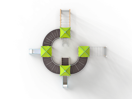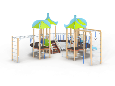 Детский игровой комплекс состоит из четырёх последовательно соединённых по окружности башен с крышами. На первой башне установлены шведские стенки, ручки вспомогательные, перекладина с канатами и внешняя шведская стенка с усиленным рукоходом. На второй башне установлены лестница и горка. На третьей башне установлены горка и фанерное ограждение. На четвертой башне установлены лиана, перекладина с канатом, вспомогательные ручки и гимнастический комплекс с кронштейнами с канатом и кольцами гимнастическими. Первая, вторая, третья и четвертая башни соединены дугообразными мостами.