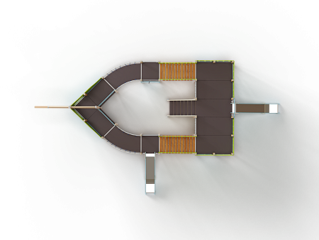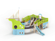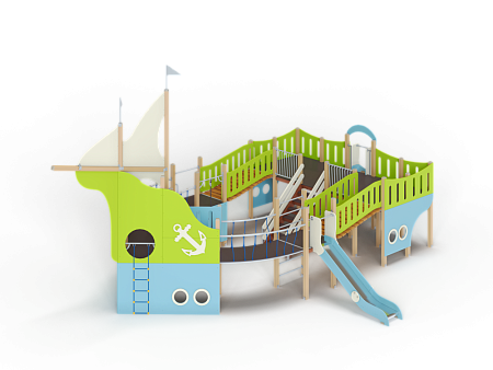Детский игровой комплекс скомпонован в форме парусника. На боковой и на кормовой части корабля установлены две горки. По периметру корабля расположены альпинистская стенка с перекладиной и канатом, две полипропиленовые лестницы, ограждения фанерные с декоративными накладками, мосты наклонные с фанерными перилами и подвесные, перекладины, декоративные фанерные паруса и металлические декоративные флажки.