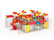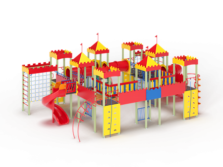 Детский игровой комплекс состоит из восьми башен с крышами. Башни расположены в форме квадрата. На первой башне установлены перекладины, шест с пластиковыми колесами, ручки вспомогательные, альпинистская стенка с перекладиной и канатом. На второй башне установлены ограждение фанерное и металлическое.. На третьей башне установлены лиана, ручки вспомогательные, альпинистская стенка с перекладиной и канатом. На четвертой башне установлена горка пластиковая винтовая, балкон. На пятой башне установлены перекладины, альпинистская стенка с перекладиной и канатом. Сбоку пятая башня имеет продолжение в виде спортивного комплекса с полипропиленовой сеткой, шведской стенкой, декоративными накладками и рукоходом. На шестой башне установлена пластиковая горка-труба, ограждение металлическое и лестница. На седьмой башне установлены перекладины, ручки вспомогательные, альпинистская стенка с перекладиной и канатом. Сбоку седьмая башня имеет продолжение в виде спортивного комплекса с полипропиленовой сеткой, шведской стенкой, фанерными накладками и рукоходом. На восьмой башне установлена винтовая пластиковая горка-труба и балкон.
