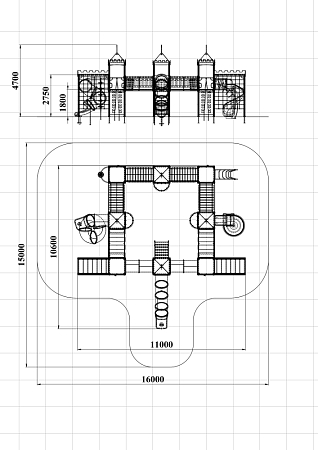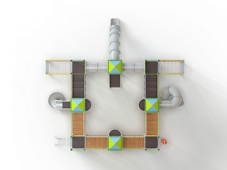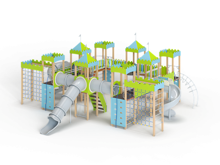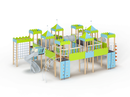 Детский игровой комплекс состоит из восьми башен с крышами. Башни расположены в форме квадрата. На первой башне установлены перекладины, шест с пластиковыми колесами, ручки вспомогательные, альпинистская стенка с перекладиной и канатом. На второй башне установлены ограждение фанерное и металлическое.. На третьей башне установлены лиана, ручки вспомогательные, альпинистская стенка с перекладиной и канатом. На четвертой башне установлена горка пластиковая винтовая, балкон. На пятой башне установлены перекладины, альпинистская стенка с перекладиной и канатом. Сбоку пятая башня имеет продолжение в виде спортивного комплекса с полипропиленовой сеткой, шведской стенкой, декоративными накладками и рукоходом. На шестой башне установлена пластиковая горка-труба, ограждение металлическое и лестница. На седьмой башне установлены перекладины, ручки вспомогательные, альпинистская стенка с перекладиной и канатом. Сбоку седьмая башня имеет продолжение в виде спортивного комплекса с полипропиленовой сеткой, шведской стенкой, фанерными накладками и рукоходом. На восьмой башне установлена винтовая пластиковая горка-труба и балкон.