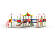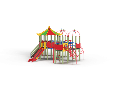 Детский игровой комплекс состоит из пяти башен. На одной башне установлена крыша в форме восьмигранной пагоды, на четырёх крыша металлическая со столбом. На восьмиграной башне установлена горка, лестница и фанерные ограждения. На башнях с металлической крышей установлены шест, шест спираль, шест с пластиковыми колесами, спираль, ограждение с круглым лазом, лиана, ручки вспомогательные, фанерные ограждения. Башни соединены двумя подвесными мостам и двумя мостами радиусными с металлическими перилами.