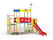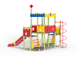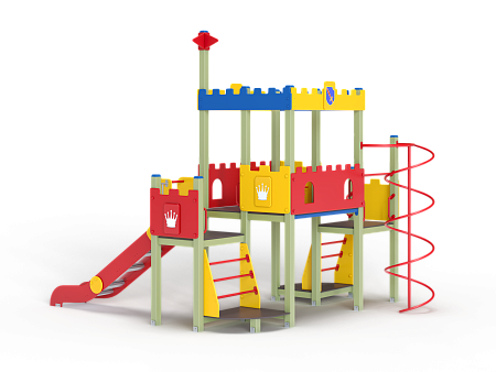 Детский игровой комплекс состоит из трех разновысоких башен. На первой башне установлена лестница, горка, фанерное ограждение и ручки вспомогательные. На второй сдвоенной башне, установлены ограждения фанерные и крыша. На третьей башне установлены ограждение, переклади-ны, шест спираль, лестница и ручки вспомогательные.