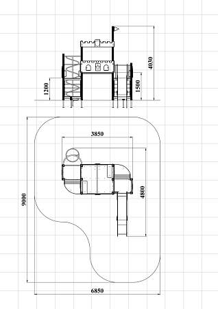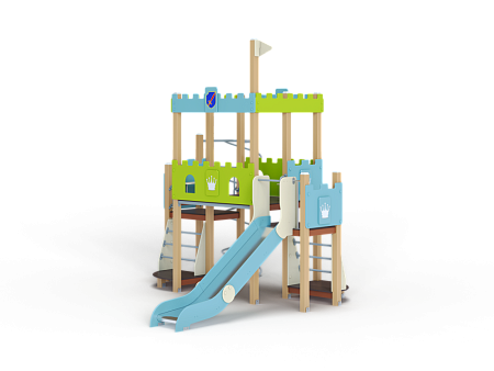 Детский игровой комплекс состоит из трех разновысоких башен. На первой башне установлена лестница, горка, фанерное ограждение и ручки вспомогательные. На второй сдвоенной башне, установлены ограждения фанерные и крыша. На третьей башне установлены ограждение, переклади-ны, шест спираль, лестница и ручки вспомогательные.