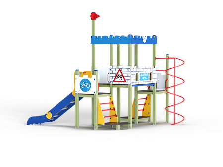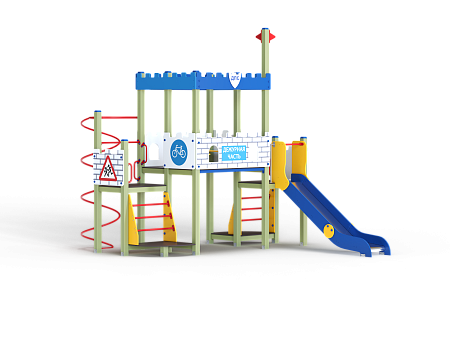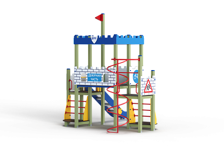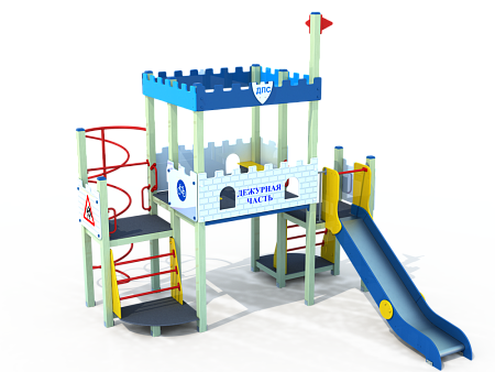 Детский игровой комплекс состоит из трех разновысоких башен оформленный в цветах службы ДПС. На первой башне установлена лестница, горка, фанерное ограждение с художественно оформленной поверхностью и ручки вспомогательные. На второй сдвоенной башне, установлены ограждения фанерные с художественно оформленной поверхностью и крыша. На третьей башне установлены ограждение фанерное с художественно оформленной поверхностью, перекладина, шест спираль, лестница и ручки вспомогательные.