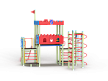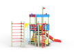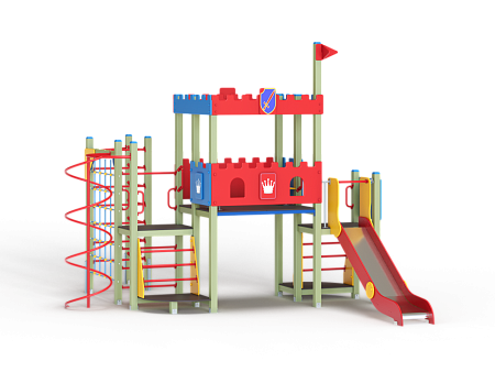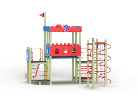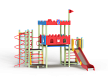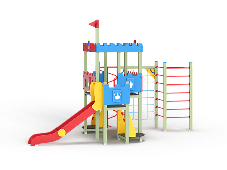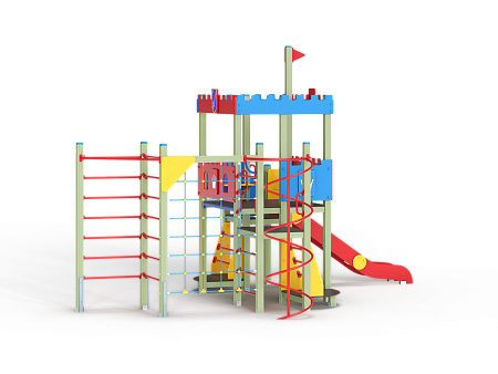 Детский игровой комплекс состоит из трех разновысоких башен. На первой башне установлена лестница, горка, фанерное ограждение с декоративными накладками и ручки вспомогательные. На второй сдвоенной башне установлены декоративные фанерные флажки, фанерные ограждения с декоративными накладками и крыша. На третьей башне установлены фанерное ограждение с декоративными накладками, шест спираль, лестница и ручки вспомогательные. К третьей башне присоединен гимнастический комплекс, состоящий из сетки полипропиленовой и двух шведских стенок.