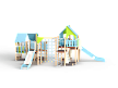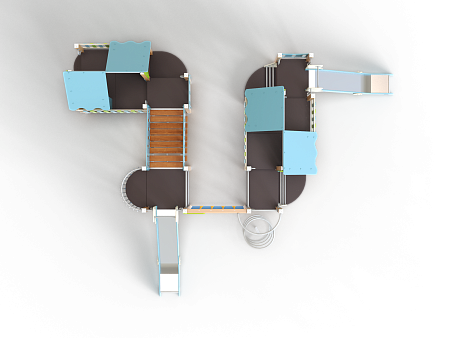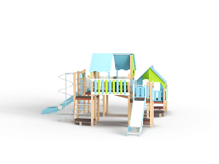 Детский игровой комплекс состоит из шести разновысоких башен. На первой башне установлена лестница, горка, фанерное ограждение и ручки вспомогательные. На второй сдвоенной башне, установлены фанерные ограждения и крыша. На третьей башне установлены фанерное ограждение, шест спираль, лестница и ручки вспомогательные. На четвертой башне установлены горка и балкон. На пятой башне установлено фанерное ограждение, лестница, вспомогательные ручки. На шестой сдвоенной установлены фанерные ограждения и крыша. Третья и четвертая башни соединены сеткой полипропиленовой, четвертая и пятая наклонным мостом с фанерными перилами.