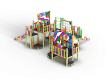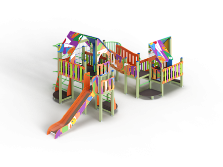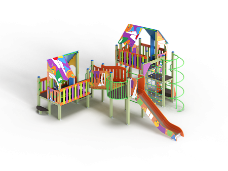 Детский игровой комплекс состоит из шести разновысоких башен с художественным оформлением в стиле граффити. На первой башне установлена лестница, горка, фанерное ограждение и ручки вспомогательные. На второй сдвоенной башне, установлены фанерные ограждения и крыша. На третьей башне установлены фанерное ограждение, шест спираль, лестница и ручки вспомогательные. На четвертой башне установлены горка и балкон. На пятой башне установлено фанерное ограждение, лестница, вспомогательные ручки. На шестой сдвоенной установлены фанерные ограждения и крыша. Третья и четвертая башни соединены сеткой полипропиленовой, четвертая и пятая наклонным мостом с фанерными перилами.