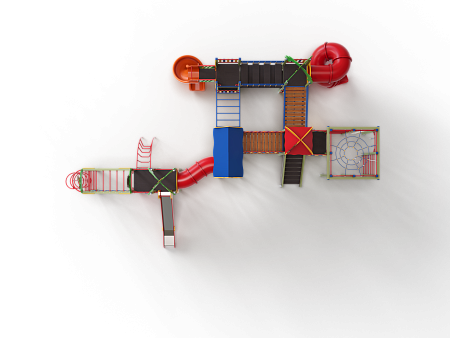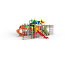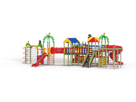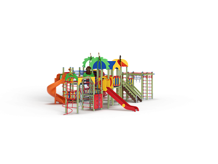 Детский игровой комплекс состоит из семи башен. На первой башне установлены лиана наклонная, альпинистская стенка с перекладиной и канатом, ручки вспомогательные, шведская стенка и имеет продолжение в виде гимнастического комплекса состоящего из сетки полипропиленовой, шеста спирали, рукохода, двух декоративных арок и шведской стенки. На второй башне установлены шведская стенка, горка и крыша с попугайчиком. На третьей башне установлены двухскатная крыша, три фанерных ограждения из балясин, шведская стенка и ручки вспомогательные. На четвертой башне установлены крыша с обезьянкой, лестница, ручки вспомогательные. На пятой башне установлены фанерное ограждение из балясин, альпинистская стенка с перекладиной и канатами. Пятая башня имеет продолжение в виде гимнастического комплекса состоящего из: сетки полипропиленовой, перекладин с лестницами, канатом и кольцами гимнастическими и шведских стенок. На шестой (разноуровневой) башне установлены фанерные ограждения из балясин, крыша с попугайчиком, пластиковой винтовой горкой-трубой. На седьмой башне установлены фанерные ограждения из балясин, детские счёты с пластиковыми бубликами, горки пластиковая винтовая, ручки вспомогательные. Вторая и третья башня соединены изогнутой трубой переходом, третья и четвертая мостом прямым с фанерными перилами, четвертая и шестая разновысоким мостом с металлическими перилами, шестая и седьмая подвесным качающимся мостом, третья и седьмая рукоходом усиленным.