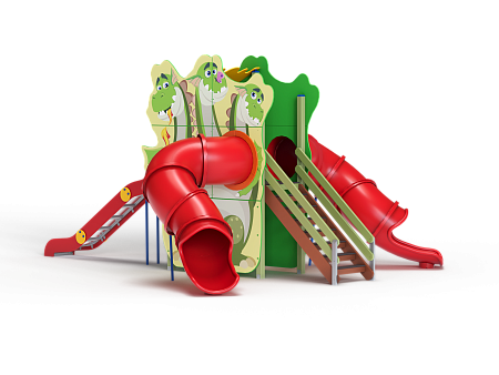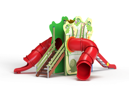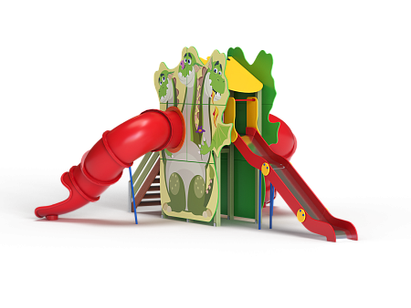 Детский игровой комплекс состоит из башни с полубашней. На полубашне установлены лестница, две горки-трубы винтовые, фанерные ограждения. На башне установлены фанерные ограждения, перекладина, ручки вспомогательные и горка. Всё ограждение фанерное имеет художественно оформленную поверхность и скомпоновано в виде трёхглавого дракона.