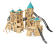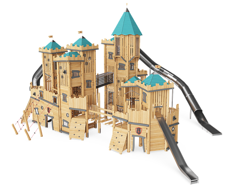 Комплекс выполнен в виде деревянного многобашенного замка. Башни имеют несколько ярусов со страховочными сетками и канатами, препятствующих свободному падению. На башнях установлены трапы, перекладины с канатами, сетки, крыши, пушки декоративные, шесты, канатные переходы, лестницы, качающееся сиденье, горка-лоток, горка-труба и шесты гимнастические из нержавеющей стали.
