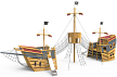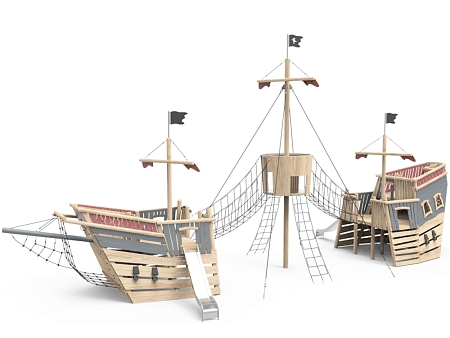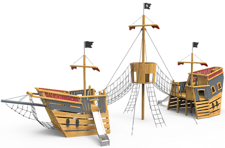 Комплекс выполнен в виде комбинации деревянных столбов и сеток, в совокупности образующих остов корабля с тремя мачтами и двумя башнями с площадками из бруса. На центральной мачте установлена обзорная корзина, через которую передняя и задняя башни соединяются канатными мостами. Вход в корзину снизу обеспечивается двумя канатными лестницами. Обшивка коробля выполнена из деревянного бруса. Задняя площадка корабля - двухъярусная, нижний ярус представляет собой каюту со столиками и сидениями. На задней площадке установлены пушки и горка из нержавеющей стали. На носовой части корабля установлены ручки, сетки, канатный обвес и горка из нержавеющей стали.