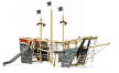 Комплекс выполнен в виде комбинации деревянных столбов и сеток, в совокупности образующих остов пиратского корабля с тремя мачтами и двумя башнями с площадками. Башни соединены подвесным бревном. Обшивка коробля выполнена из деревянного бруса. На задней части корабля установлены пушки, сетка и горка из нержавеющей стали. На носовой части корабля установлены ручки, лестницы канатные, сетки и канатный обвес. В центре корабля расположен столик с "раковиной" под песок и подвижное приспособление для транспортировки песка с области грунта на столик.