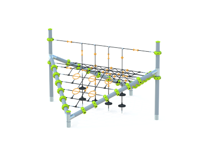 Комплекс состоит из столбов выполненных из древесно-полимерного композита (ДПК) диаметром 125 мм, имеют профиль с канавками. Все металлические элементы выполнены из стали с оцинкованным покрытием, с антивандальными и безопасными соединениями между собой. Оцинковка металла производится методом электрохимической гальванизации. Сетки и канаты изготовлены из многожильного армированного износостойкого каната. Различных эелементов выполненых из HDPE пластика.