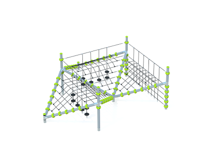 Комплекс состоит из столбов выполненных из древесно-полимерного композита (ДПК) диаметром 125 мм, имеют профиль с канавками. Все металлические элементы выполнены из стали с оцинкованным покрытием, с антивандальными и безопасными соединениями между собой. Оцинковка металла производится методом электрохимической гальванизации. Сетки и канаты изготовлены из многожильного армированного износостойкого каната. Различных эелементов выполненых из HDPE пластика.