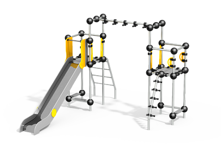 Универсальный комплекс состоит из гимнастического оборудования и двух башен с площадками, соединенных рукоходом. Одна башня с ручками, ступеньками и горкой, вторая башня с ручками и ступенью. Все металлические элементы башен и гимнастического оборудования выполнены из стали с оцинкованным покрытием, с антивандальными и безопасными соединениями между собой. Оцинковка металла производится методом электрохимической гальванизации. Скат горки выпонен из нержавеющей стали. Площадки, ступени, ручки, борта и ограждения горки выполнены из HPL пластика.