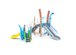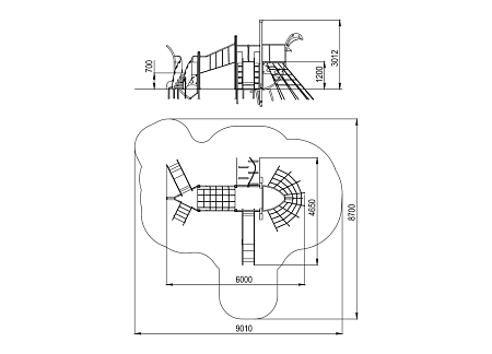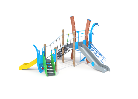 Комплекс состоит из двух металлических каркасов с площадкой,соединенных разновысоким качающимся мостом. На одной площадке расположены горка, две деревянные стойки, сетка, декоративные элементы и трап с канатом. На второй площадке расположены лестница, горка и декоративные элементы. Металлокаркас покрыт в два слоя порошковой полимерной краской. Сетки изготовлены из многожильного армированного износостойкого каната. Деревянные стойки выполнены из тщательно отшлифованной древесины высочайшей прочности и окрашены высококачественным лаковым покрытием. Декоративные элементы и борта горок выполнены из HPL пластика.