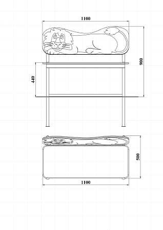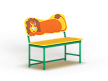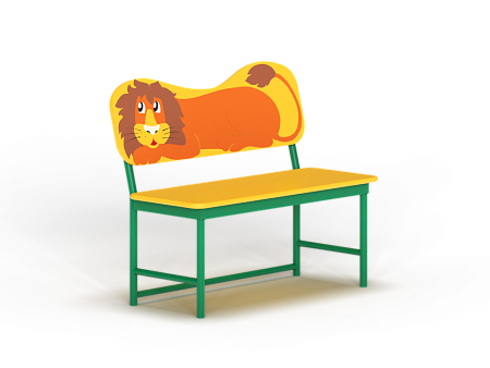 Лавочка со спинкой выполнена из металлокаркаса, фанерного сидения и фанерной спинки в форме львенка с художественным оформлением.