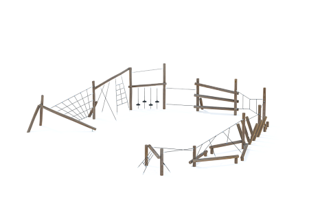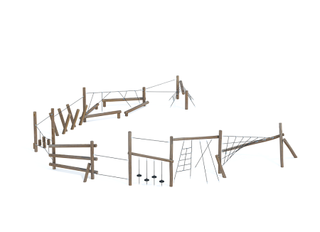 Комплекс выполнен в виде комбинации гимнастических элементов выполненных из столбов, бревен и сеток, в совокупности представляющих полосу препятствия.