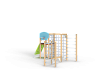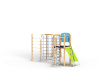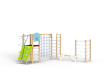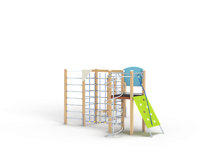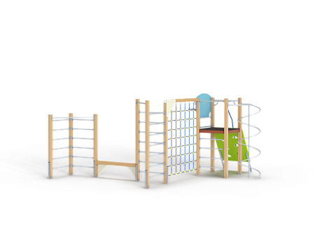 Спортивный комплекс состоит из башни на которой установлены наклонная альпинистская стенка, перекладина с канатом, шест спираль, перекладины, баскетбольный щит с кольцом и ручки вспомогательные. Сбоку от комплекса установлены две угловых шведских стенки соединенных между собой бум бревном. Стенки соединены с башней вертикальной полипропиленовой сеткой.