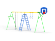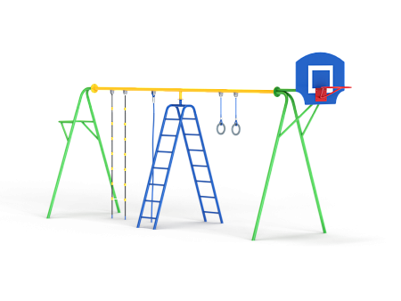 Спортивный комплекс выполнен из металлического каркаса состоящего из четырех частей: двух боковых стоек, одной центральной в форме Л-образной лестницы и перекладины. На одной боковой стойке расположен турник, на второй баскетбольный щит с кольцом. На перекладине установлены навесные элементы: лестница полипропиленовая, канат и кольца гимнастические.