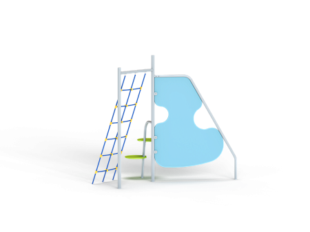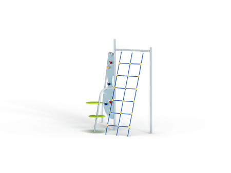 Спортивный комплекс состоит из сборного металлокаркаса к которому крепятся фанерная стенка с альпинистскими камнями, две фанерные круглые ступени и сетка полипропиленовая наклонная