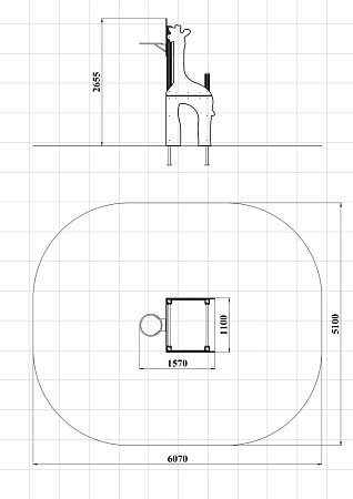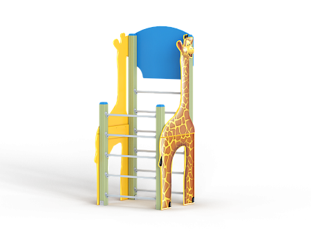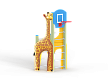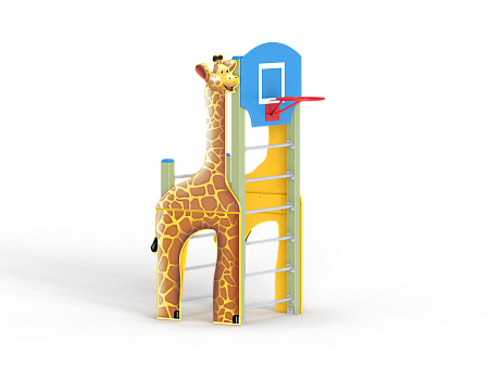 Спортивный комплекс состоит из столбов с перекладинами между ними, фанерных стенок с ручной художественной росписью в виде жирафа и баскетбольного щита с кольцом.