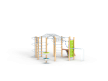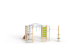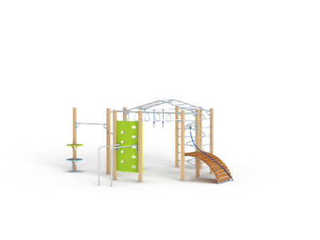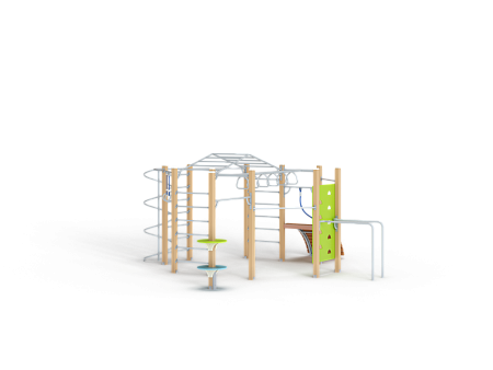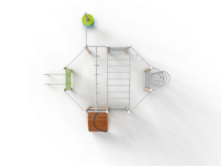 Спортивный комплекс оборудован рукоходом изогнутым, рукоходом с кольцами, шведскими стенками, брусьями изогнутыми, кольцам гимнастическими, трапом барабанов с перекладиной и канатом, шестом спиралью, перекладинами, альписнистскими стенками и круглыми фанерными столиками.