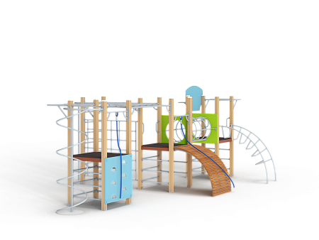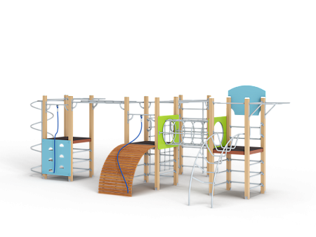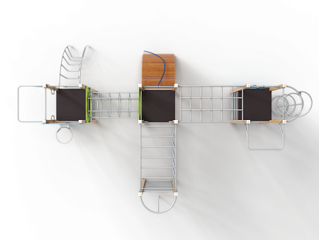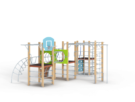Спортивный комплекс состоит трёх башен, соединенных между собой металлическим переходом из колец и и металлическим рукоходом-сеткой. На первой башне установлены лиана, шведские стенки, перекладины, турник приставной, ручки вспомогательные и баскетбольный щит с кольцом. На второй башне установлены трап барабан с перекладиной и канатом, шведские стенки, и ручки вспомогательные. Вторая башня имеет продолжение в виде гимнастического комплекса в виде шведской стенки и шеста, соединенного с башней рукоходом. На третьей башне установлены альпинистская стенка с перекладиной и канатом, шведские стенки, шест спираль, перекладина и турник приставной.